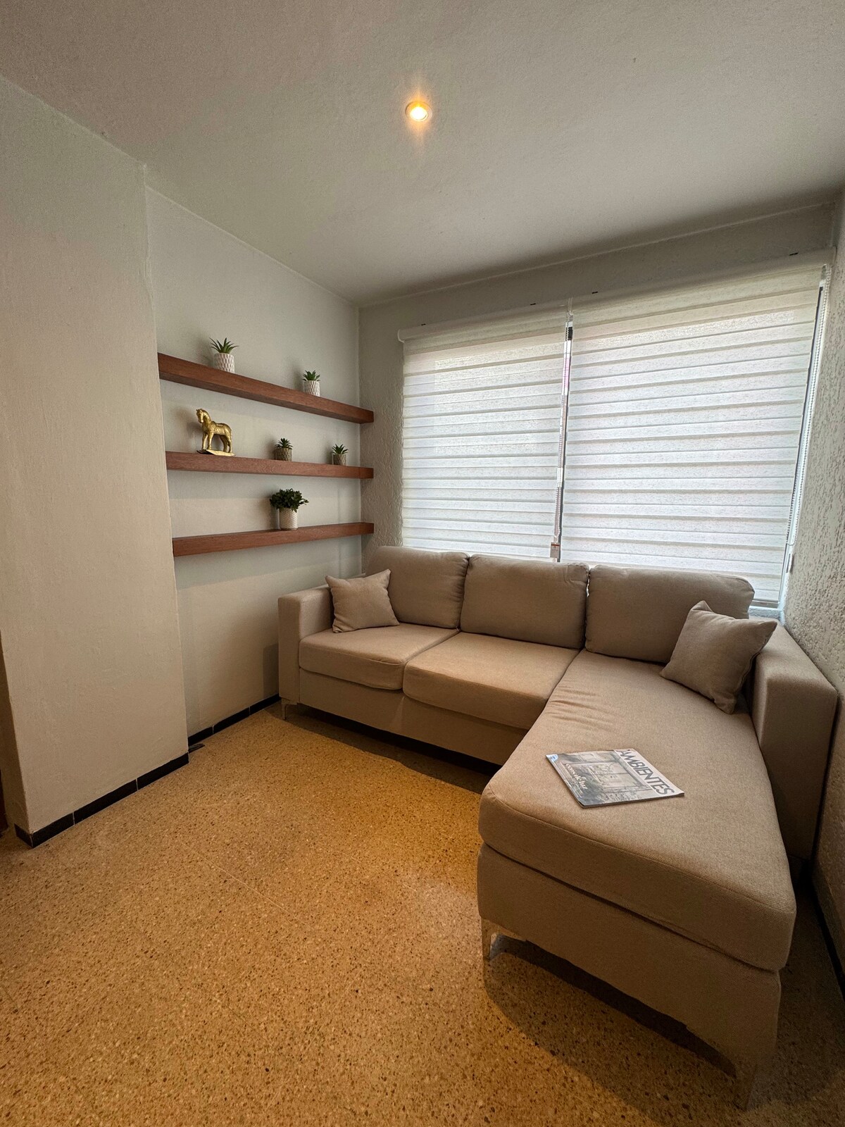 Ubicado en un primer piso, el Depto Cuenta con 2 sofás en la sala, un comedor con cuatro sillas de madera, la cocina cuenta con refrigerador, estufa de inducción, platos, vasos, tazas, cubiertos, jabón para platos, horno de microondas, utensilios de cocina, sartén, etc; en la habitación cuenta con una cama matrimonial con su juego de sábanas, un buró con lámpara de lectura, televisión con Netflix, aire acondicionado y en la segunda recámara una cama con sus sábanas, Buró y aire acondicionado