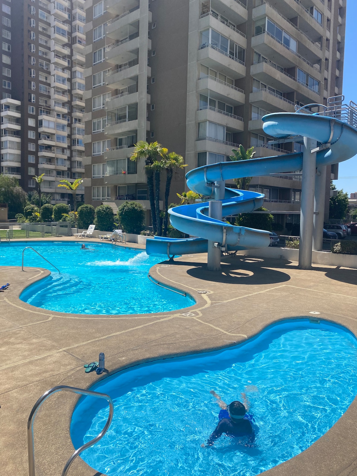 Disfruta de una grata estadía en un tranquilo, cómodo y céntrico departamento. Este se encuentra a pasos de centro comercial y supermercado, a 10 minutos de la playa, a una cuadra del metro tren y con locomoción a la puerta, que permite trasladase a diferentes puntos de la región. Cerca de terminal de buses interurbanos. Cuenta con seguridad 24/7 , estacionamiento subterráneo, areas comunes, piscina, sala pool, cine , gym , quincho, jacuzzi y sauna.