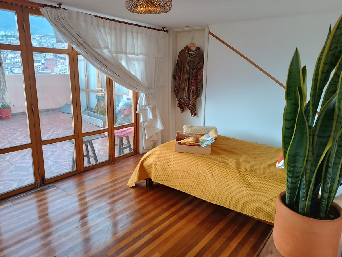 Cozy apartment remodeled in the colonial quarter of Quito, located on the third floor, a loft with a spectacular panoramic view of the Historic Center. It has two bedrooms, two bathrooms, a living room, a dining room, and a kitchen equipped with filtered water and essential implements to meet our guests' needs. The comfortable facilities provide good relaxation. We have Wifi 620Mbps a 1.05Gbps, a telephone line, a television with Netflix, and heaters for the shower and kitchen sinks.