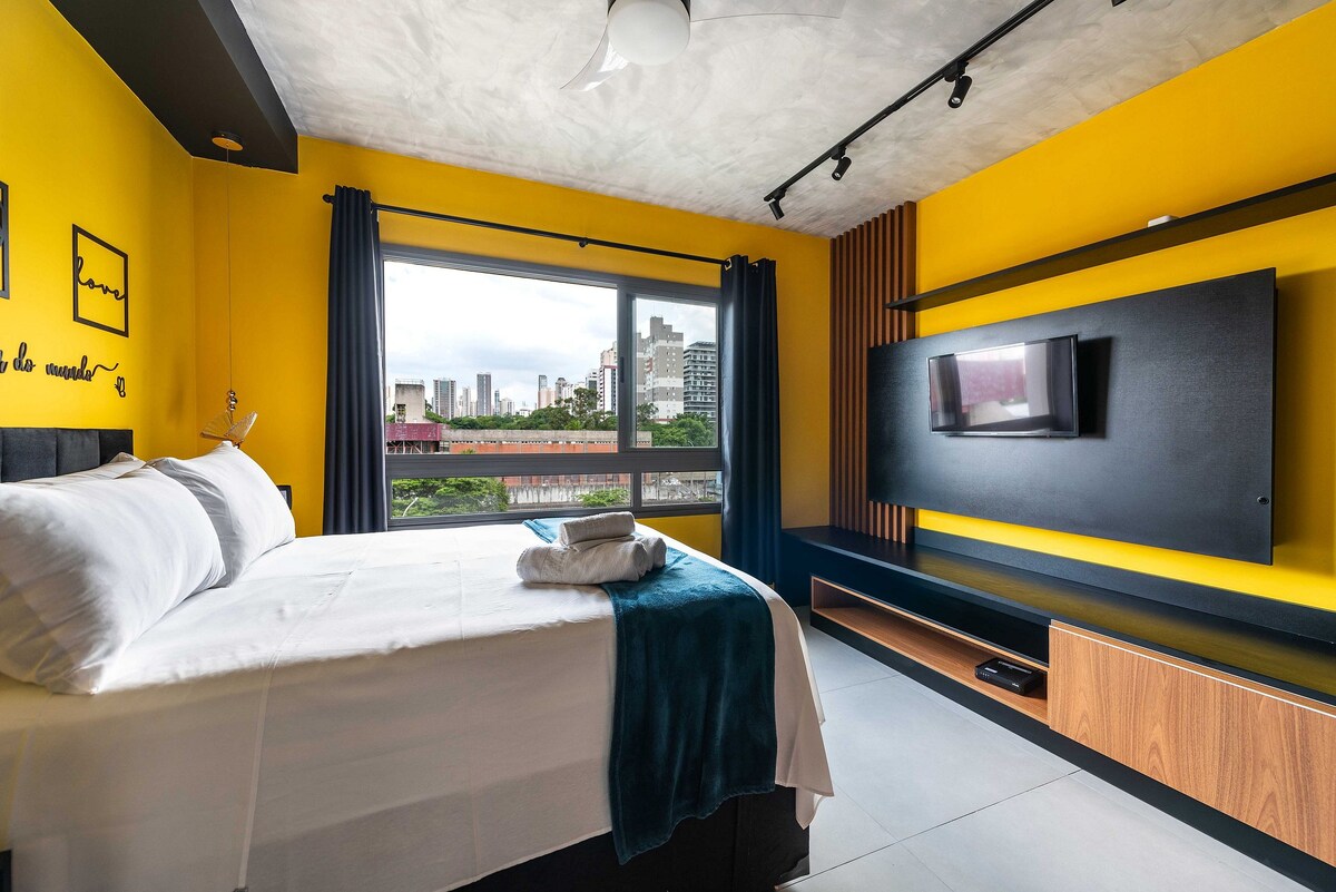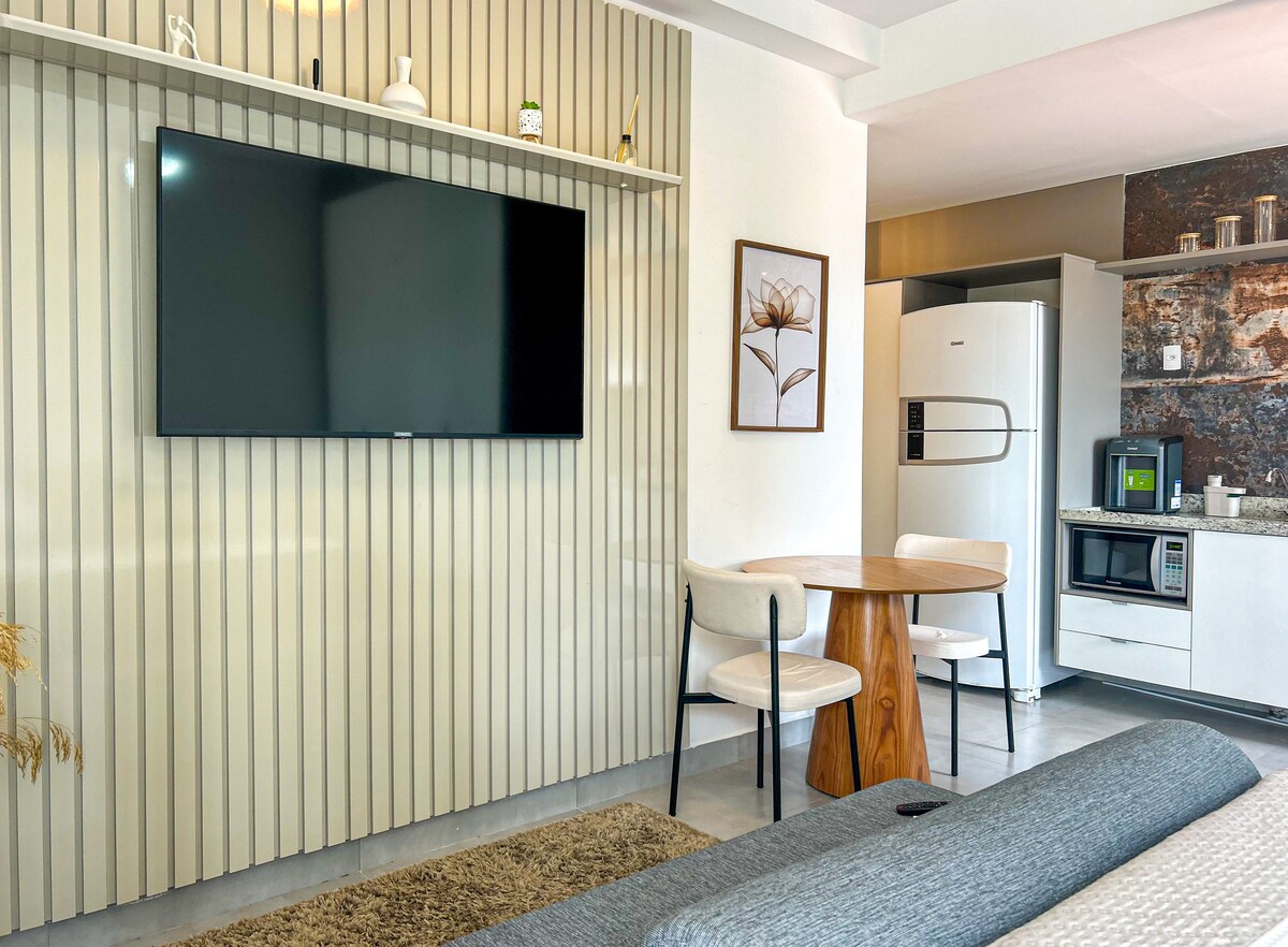 Estudio moderno completo con vaga, TV de 75” y Wi-Fi