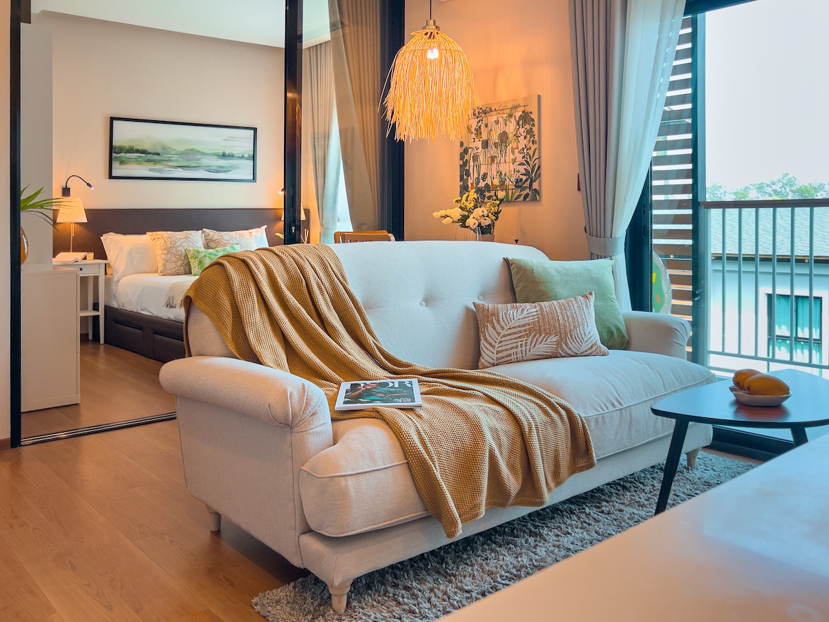 Estudio moderno en The Title III – A poca distancia a pie de la playa de Rawai Disfruta de una estancia cómoda en este elegante departamento tipo estudio en el condominio The Title III en Rawai, una de las zonas más populares de Phuket para estadías largas y vacaciones relajantes. El departamento está cuidadosamente diseñado y totalmente equipado tanto para estancias cortas como largas. Cuenta con una cama cómoda, un baño moderno, una cocina pequeña, un comedor y un balcón privado donde puedes relajarte después de un día explorando la isla.
