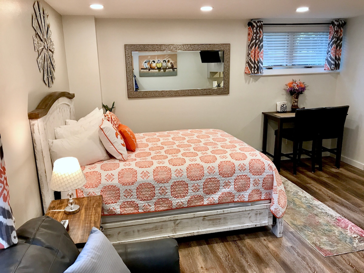 ESTRICTO: NO SE PERMITE FUMAR/NO SE ADMITEN ANIMALES. El APARTAMENTO ESTUDIO está a 1 manzana de Town Square. Detalles: Según nuestras leyes locales, cobramos un 8 % de impuesto sobre las ventas. Apartamento tipo estudio MUY PEQUEÑO en el sótano, 350 pies cuadrados. No apto para niños menores de 12 años. Nuevo colchón tamaño queen, noviembre de 2023. Cocina pequeña pero totalmente equipada. Direct TV/Satélite; sin reproductor de DVD. Internet de alta velocidad. Hay aparcamiento gratuito. Lavadora/secadora a monedas compartida. Agua caliente ilimitada. Suelo radiante SIN AIRE ACONDICIONADO Permiso n.º 6907