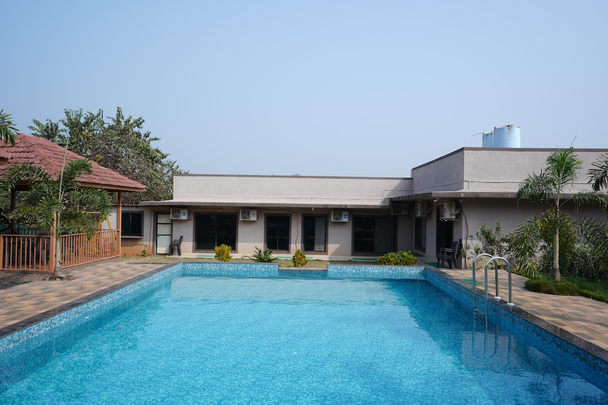 Te esperan vacaciones que admiten mascotas, experiencias gastronómicas exclusivas y un bienestar inigualable Relájate y desconecta en este alojamiento tranquilo y elegante. Amplias habitaciones de estilo casa de campo con baño en una plantación de cocos establecida en Alibaug, lo que lo convierte en un entorno idílico para unas vacaciones felices. Esta propiedad privada cuenta con OCHO HABITACIONES GRANDES de estilo casa de campo separadas con un salón junto a la piscina y un espacio de sala de estar separado para comer. Cada habitación es exclusiva para los huéspedes, solo la PISCINA y la sala de estar son compartidas.