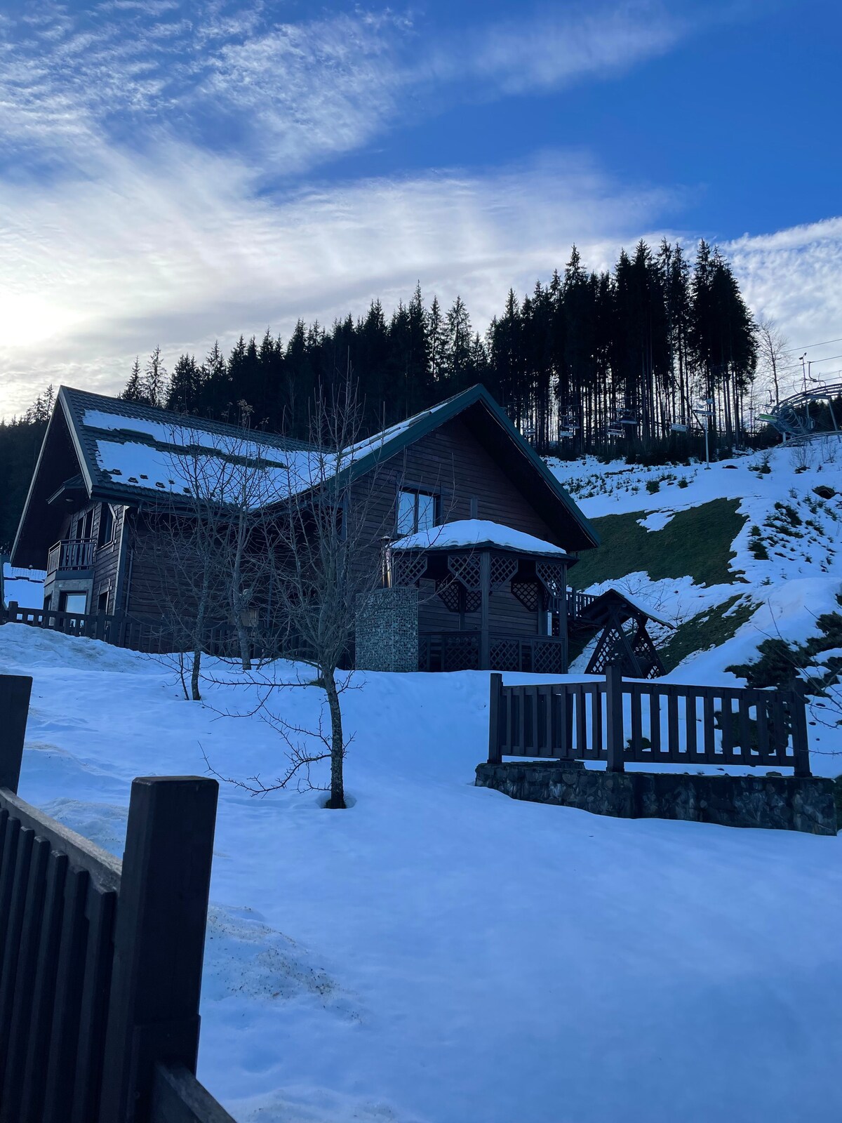 Cómoda casa de madera en los Cárpatos, cerca de la estación de esquí Bukovel. Una cabaña independiente de corte manual, una amplia terraza con excelentes vistas a las cumbres de las montañas Hoverla, Petros, Blyznytsi... Una bañera de hidromasaje al aire libre en nuestra terraza es el mejor reemplazo para una sauna. Chimenea de leña, suelo radiante en los baños, cocina completa con electrodomésticos y vajilla. En la calle hay una parrilla para cocinar al fuego. Y lo más importante: un ambiente inolvidable, soledad, belleza y comodidad.