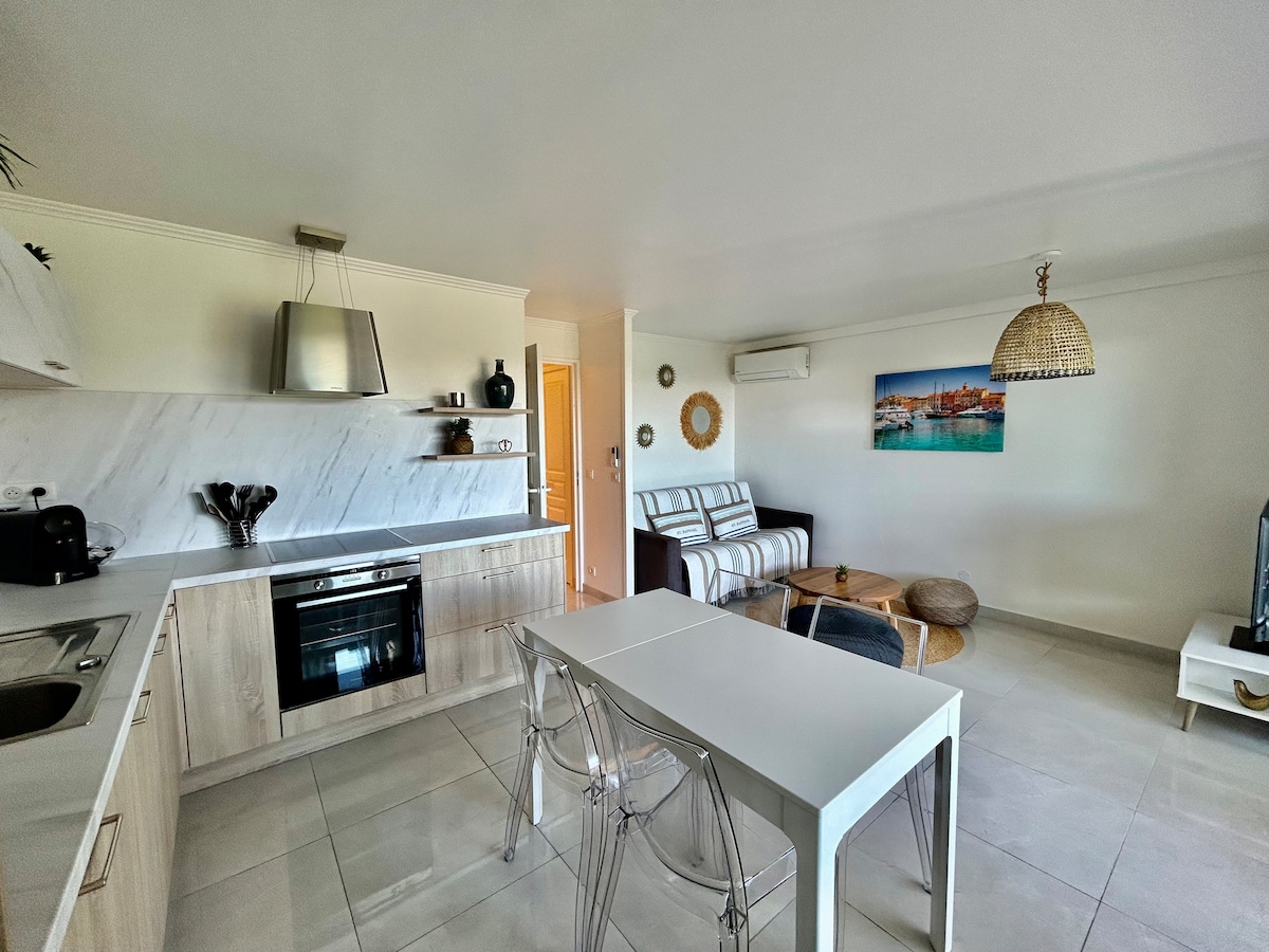 ALOJAMIENTO MUEBLE CLASE DE TURISMO Relájese en este alojamiento cómodo y acogedor. Ideal fin de semana chill 🌞 Playa, centro de la ciudad de Port Grimaud y restaurantes a pie. APARCAMIENTO PRIVADO CERRADO Encantador apartamento con todas las comodidades renovado en 2025 en un tema cálido. Materiales de calidad con piedra en el suelo, cuarto de baño nuevo de hormigón encerado. Cocina totalmente equipada ¡La estancia y la logia ofrecen vistas panorámicas de los canales! Entorno relajante y de gran belleza. NO FUMADORES