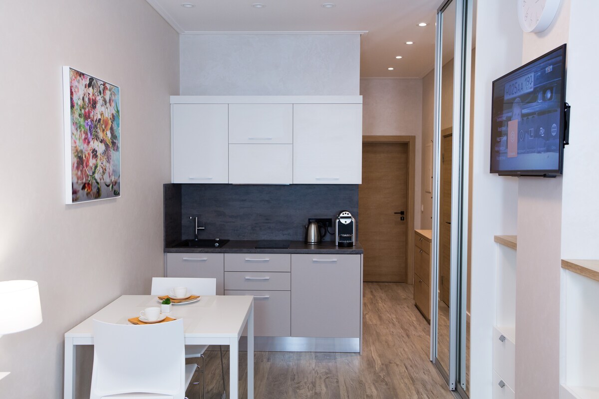 Los estudios están ubicados en el primer, segundo y tercer piso del edificio y ofrecen 27 metros cuadrados. Las habitaciones tienen una cama tamaño king con un colchón cómodo. Cada suite tiene un escritorio, una mesa de comedor, una cocina totalmente equipada, un balcón con mesa y sillas para relajarse al aire libre y un baño con ducha a ras de suelo. Durante el día, las suites tienen abundante luz natural y por la noche las cortinas opacas garantizan un nivel perfecto de oscuridad. El diseño es nuevo, sencillo y fresco