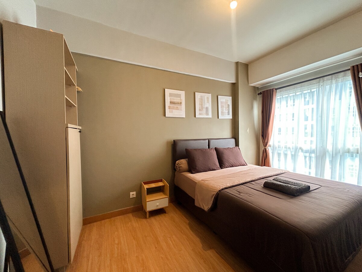 Acogedor y moderno 1 dormitorio en Scientia Residences con vistas a la piscina. Ofrecemos habitaciones cómodas y espaciosas y wifi de alta velocidad. Muy adecuado para aquellos que quieran quedarse de vacaciones o trabajar. Nuestra ubicación es muy estratégica, a un paso de SDC y a solo 6 minutos del centro comercial Summarecon Serpong y del centro culinario con tu vehículo. Nuestra habitación es para no fumadores.