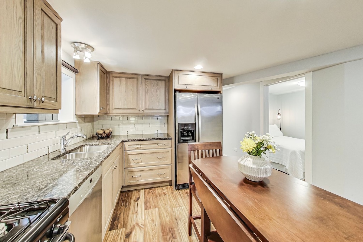 Amplio espacio de 1 dormitorio decorado con buen gusto y bien equipado. Capacidad para 4 personas (5 con hinchable disponible). Cama tamaño queen en el dormitorio principal, futón de tamaño completo en la sala de estar. Lo suficientemente espacioso para que 2 personas trabajen cómodamente. Uso del patio, fogata y parrilla. Ubicado en la vibrante Lincoln Square. A pocos pasos de la estación de la línea marrón de Rockwell, restaurantes, una tienda de bagels y un estudio de yoga/masajes. ¡A unas manzanas hay tiendas, restaurantes y un cine! Fácil estacionamiento en la calle con permisos gratuitos. Cargador de vehículos eléctricos de nivel 2 disponible.
