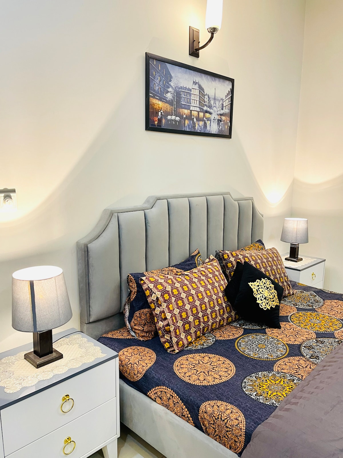 Bienvenido a nuestras elegantes suites de dos dormitorios en DHA 5 Islamabad. Disfruta de la comodidad de un viaje rápido y relájate en un espacio con una decoración encantadora y un cine en casa totalmente equipado. Ideal para viajeros que buscan comodidad y entretenimiento, este acogedor refugio ofrece comodidades modernas en una ubicación privilegiada. Es una porción completamente separada con su propia entrada y estacionamiento separados, apto para familias, por lo tanto, muy seguro y tranquilo. No se permiten fiestas ni música alta. No se admiten parejas solteras