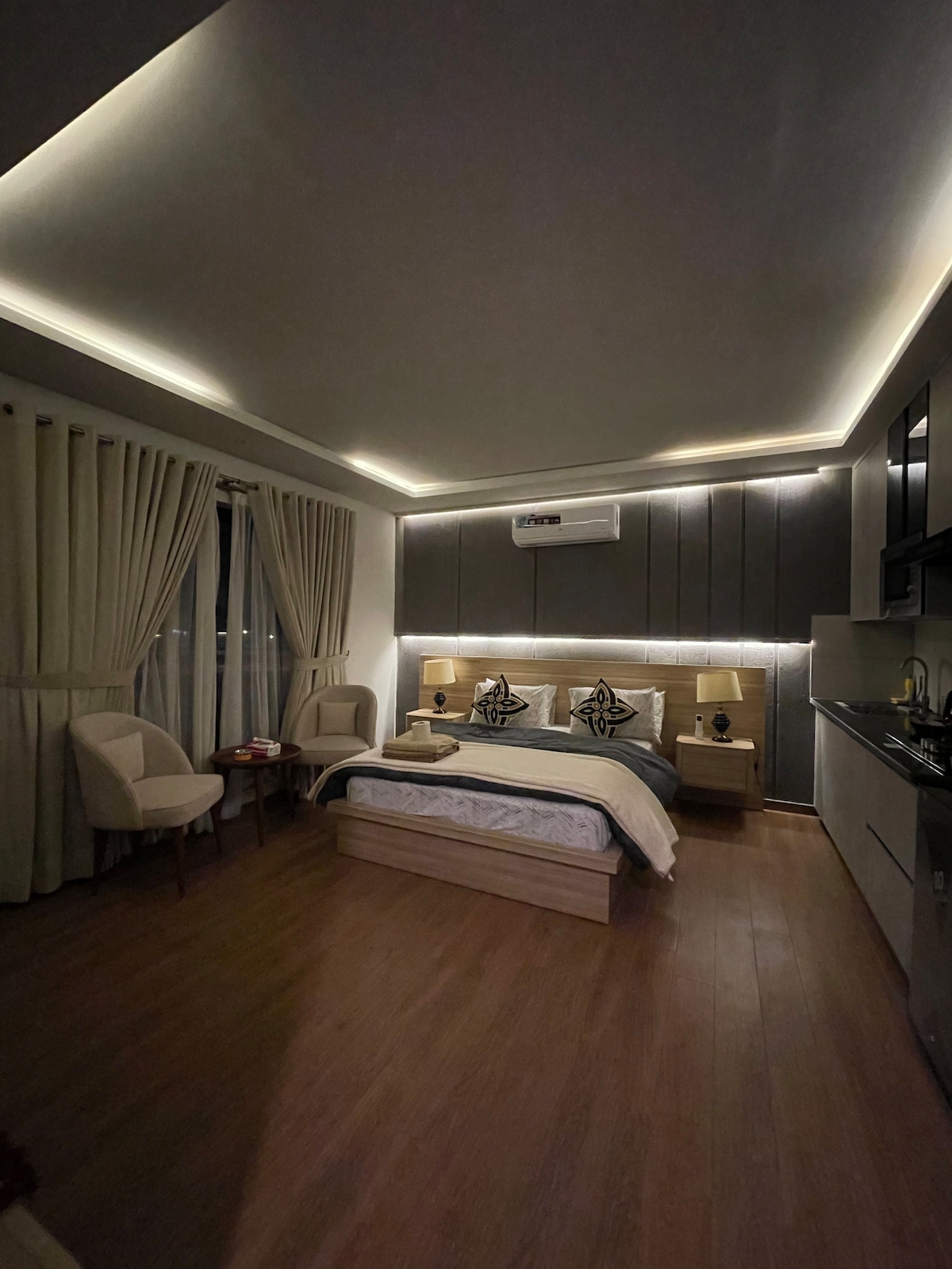 ✨ Estancia moderna y acogedora ✨ Disfruta de un refugio elegante con una cama tamaño queen, una decoración elegante y una iluminación cálida. Las grandes ventanas ofrecen una hermosa vista, mientras que la cómoda zona de estar es perfecta para relajarse. ✅ Características principales: Interior moderno y luminoso Aire acondicionado Ubicación tranquila y privada 📍 Cerca de cafés, tiendas y atracciones, ideal para parejas o viajeros solitarios.