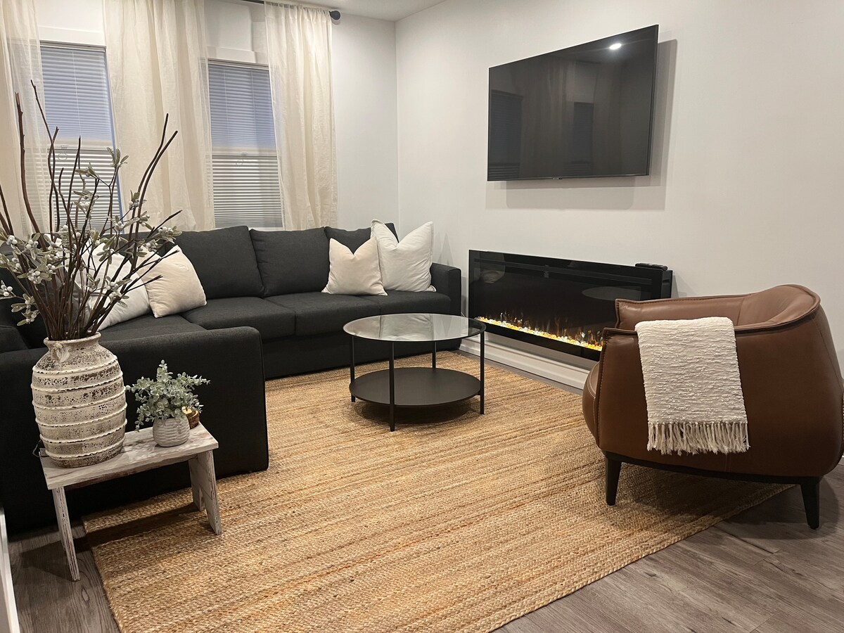 SUITE KING***Acogedora suite king de 1 dormitorio, entrada completamente independiente, construcción nueva con patio privado y patio de cemento, estacionamiento fuera de la calle con un enchufe para la temporada de invierno. Cuenta con una cama tamaño king con persianas opacas y un sofá cama tamaño queen con ropa de cama de lujo, cocina completa y lavadora/secadora. Disfruta de calefacción en el piso y techos de 9 pies, creando un espacio luminoso y cómodo perfecto para la privacidad y la relajación. **** algunos días existe la posibilidad de transferencia de ruido desde la vivienda principal