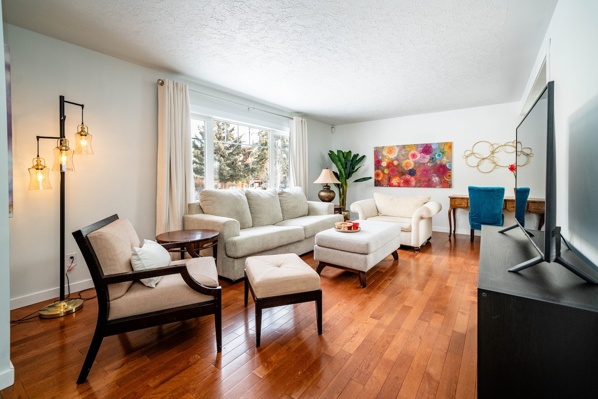 Retírate a esta cómoda y completamente amueblada suite de dos dormitorios, casi sin escaleras, con un hermoso sendero para caminar ubicado justo detrás de ella: ideal para andar en bicicleta, patinar o dar un paseo. Ubicado convenientemente cerca del centro de Collicut y del parque Westerner, es una base ideal para explorar Red Deer. Ya sea de vacaciones o en un viaje de negocios, puedes disfrutar de tu estancia en este alojamiento lejos de casa con TV, wifi, cocina completa, patio/patio trasero privado y un espacio de trabajo tranquilo y dedicado.