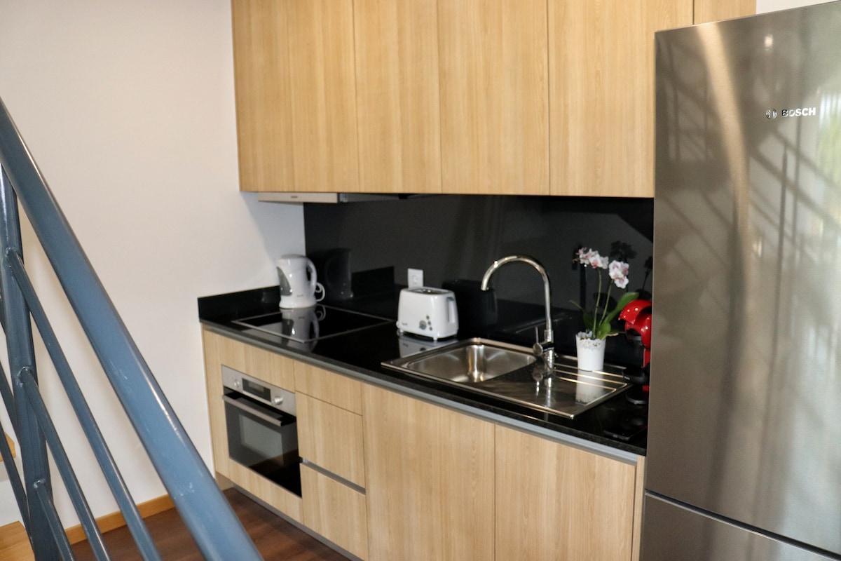 O apartamento (Penthouse) tem um terraço com vista Rio, com jardim vertical. Um quarto com cama de casal de 1,60 x 2,0 metros, roupeiros e cofre. Uma sala com sofá, TV, Netflix, Sistema de som Bluetooth Rotel. Bar com bebidas gràtis. Cozinha equipada com: Microondas, Frigorífico, Máquina de Lavar Louça, Maquina de lavar e Secar Roupa, Placa de Indução, Torradeira, Chaleira e Nexpresso. Casa de banho completa com bidé e duche, secador de cabelo e amenities (gel de banho, champô e creme corporal).