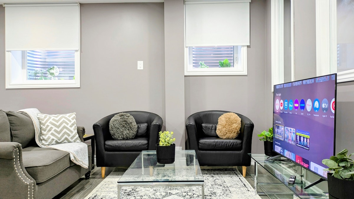 ¡Te damos la bienvenida a tu acogedor hogar lejos de casa en Milton! Este luminoso y moderno apartamento en el sótano ofrece comodidad, privacidad y conveniencia a solo 4 minutos de la estación GO de Milton y a 5 minutos de la autopista 401. Cerca de parques, restaurantes y el Real Canadian Superstore, es perfecto para familias, parejas o viajeros de negocios. Disfruta de una entrada privada, cocina totalmente equipada, cómoda sala de estar con televisor inteligente, estacionamiento gratuito en la entrada y registro automático fácil para una estancia relajante y bien conectada.