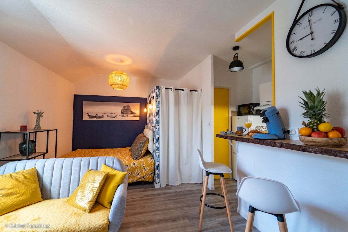 Situado en una residencia segura y tranquila en una pequeña plaza, al abrigo de las miradas y del paso, fiestas prohibidas.( guarda en el lugar ). Encantador estudio de 24 m2 optimizado y reformado (2023) con aspecto de un gran será el garante de sus vacaciones exitosas en el centro de la ciudad de La Rochelle. al pie del mercado central, descubrirá a pie el puerto viejo, sus calles empedradas, el casco antiguo, estación de tren a 10 minutos a pie Opcionalmente GARAJE SEGURO a 50 metros de la residencia. WIFI con FIBRA y paquete de TV