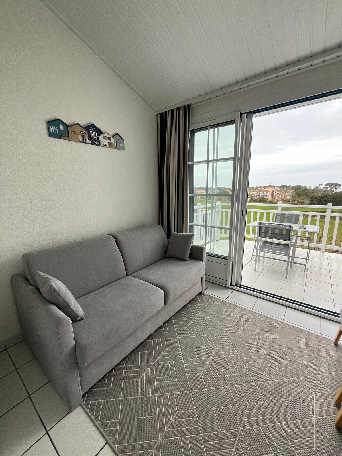 Apartamento para 3/4 personas, terraza con vistas al campo de golf, los pinos y el mar. Actividades disponibles en el lugar: Del 27 de abril al 15 de septiembre: Zona acuática accesible con pulseras disponibles en el apartamento. Clases de aquagym gratuitas de lunes a viernes en julio y agosto. Suministro gratuito de raquetas de tenis y palos de golf en la recepción de la casa de animaciones. Animaciones en julio y agosto en el complejo. Puerto de Bourgenay a 5 minutos a pie. Playa de Veillon a 15 minutos