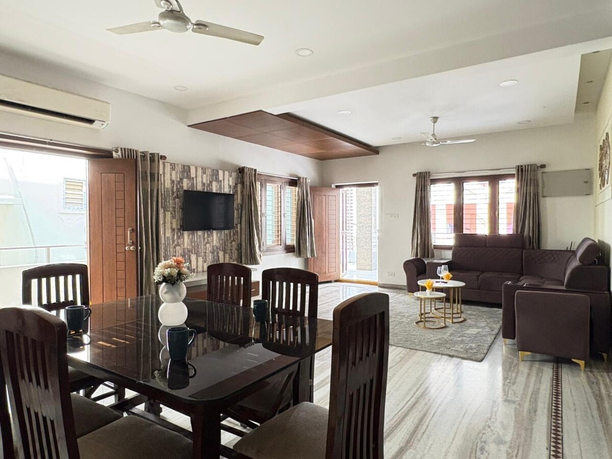 Alójate en Blue Haus, un espacioso 3BHK en el corazón de la ciudad. Perfecto para familias, amigos, viajeros de negocios o trabajadores remotos, ofrece wifi de alta velocidad gratuito y una suscripción a Netflix para entretenimiento y productividad. Con una ubicación céntrica, es fácil explorar partes antiguas y nuevas de la ciudad. El aeropuerto está a 45–50 minutos y la estación de tren a solo 10 minutos.