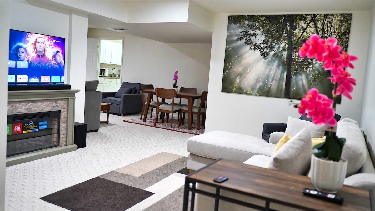 Welcome to our stylish basement apartment, perfect for modern travelers. Whether you're here for work or leisure, this space has you covered. Situated minutes from the Metro, Airport, and major work centers. The apartment features a desk with dual monitors, keyboard, mouse, and 1GB internet. At night, relax in the plush king-size bed. A convertible futon couch with a 65-inch TV, awaits your binge-watching sessions. A washer/dryer and full kitchen, w/refrigerator and stove complete the space.