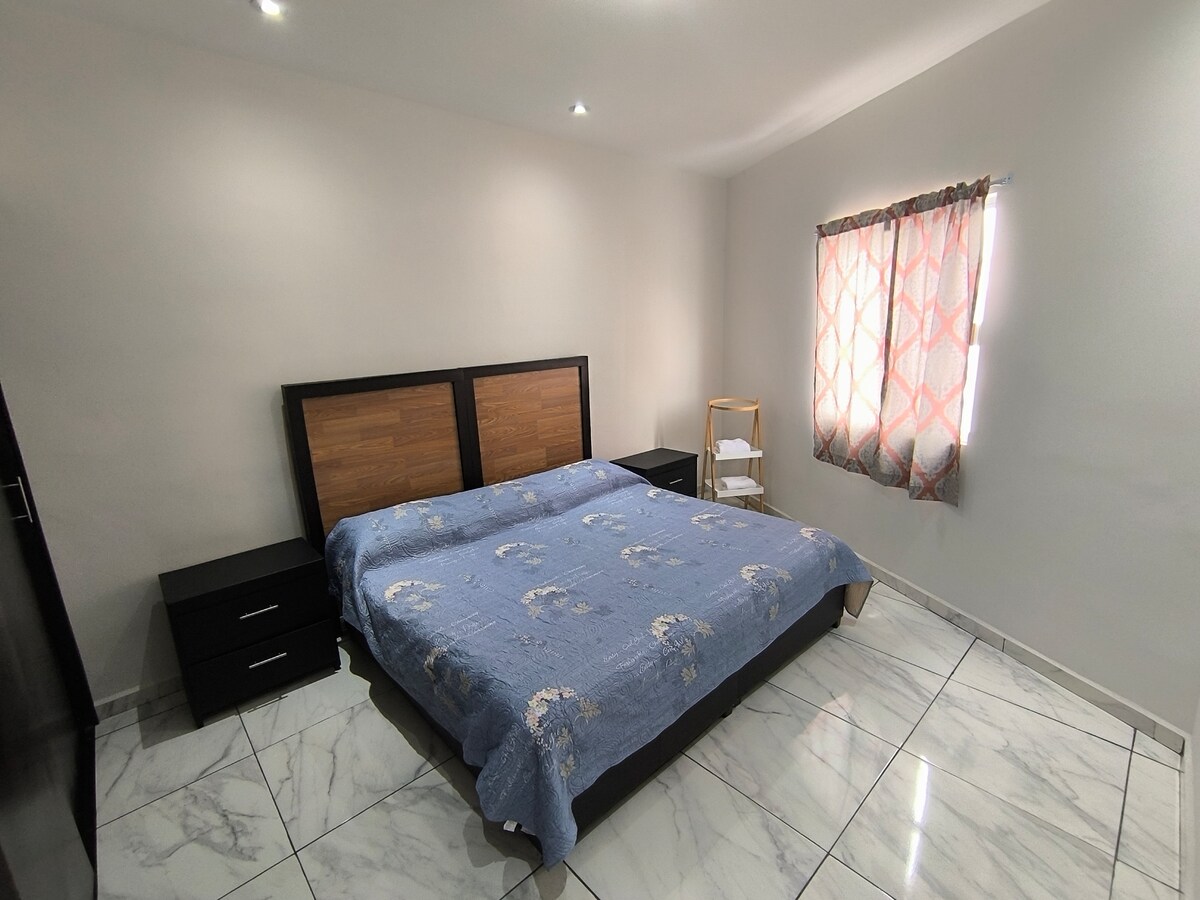 Relájate en esta casa completa ubicada frente al parque de una colonia tranquila. Ideal para dos personas. Cuenta con 1 habitación, 1 cama cómoda, 1.5 baños, sala, cocina equipada y área de trabajo, con aire acondicionado en toda la casa. Estacionamiento privado y techado, con área de asador. ¡Las mascotas son bienvenidas! Tiendas de conveniencia, farmacias y restaurantes se encuentran a menos de 5 minutos. ¡Te esperamos con un espacio limpio, cómodo y en una excelente ubicación!