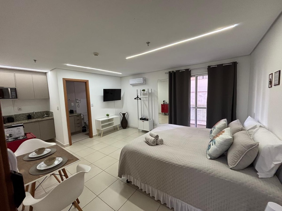 Apartamento Studio nuevo y moderno ubicado en una zona privilegiada de Ribeirão Preto, cuenta con Wi-Fi, aire acondicionado, cocina completa, smart Tv 40', gimnasio BlueFit en el edificio, Air fryer, plaza de garaje y área de ocio completa, piscina, sauna, sala de juegos, espacio gourmet, espacio de coworking para trabajar, home market 24h y la mejor ubicación de la ciudad, en la Avenida Presidente Vargas a 3 minutos del centro comercial Ribeirão y cerca de los mejores parques, bares y restaurantes de Ribeirão.