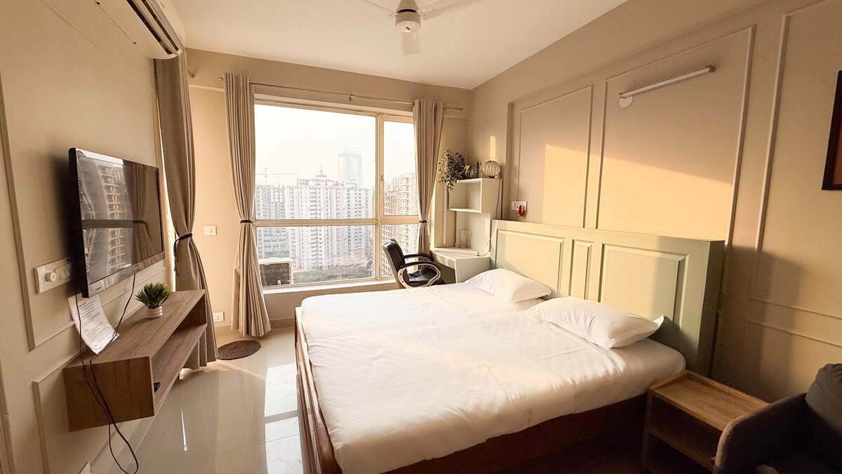 El primer apartamento de 2 Bhk que cumple con todos los requisitos ✨ - 2 dormitorios ( dormitorio principal, segundo dormitorio). - Dos camas tamaño king. - Una amplia sala de estar con una cómoda disposición de asientos. - 2 baños ( 1 en cada uno de los dormitorios). - Cocina pequeña (con todos los utensilios básicos de cocina disponibles y servicios abastecidos, es el lugar perfecto para preparar tus comidas favoritas) - Una zona de balcón compartido que conecta con el apartamento, que puede ser el espacio perfecto para tus paseos nocturnos. ¡Reserva ahora!