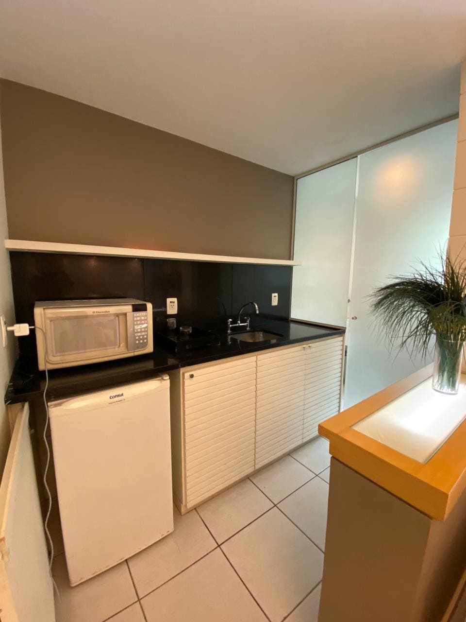 Hermosa suite , balcón gourmet, vistas a la playa de Barra da Tijuca, Pedra da Gávea y Canal da Barra. Pequeño balcón con encimera de lavavajillas, equipado para comidas rápidas y prácticas con microondas, freidora de aire, sándwichera, cafetera, tostadora , minibar, cubiertos, platos, vasos y pequeñas ollas de microondas. LA ATENCIÓN NO TIENE ESTUFA NI SARTENES. Habitación cómoda con mesa y 2 sillas, cama doble, armario y aire acondicionado. Baño con ducha de agua fría y caliente.