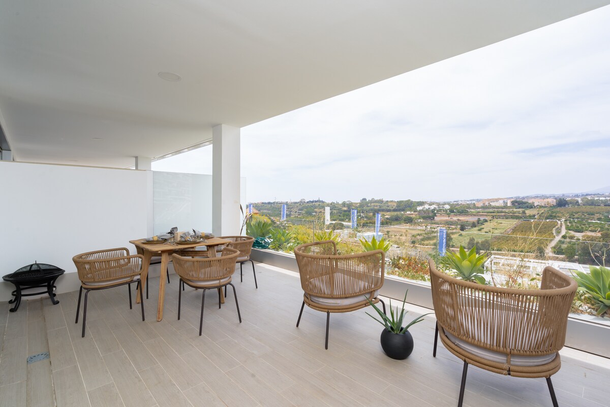 Despiértate con cielos azules y vistas impresionantes al mar desde tu azotea privada🌊. Disfruta de atardeceres dorados, una copa de vino o toma el sol en privado. Este luminoso apartamento en Pueblo Paraíso está a solo 12 minutos de las playas, el golf y el casco antiguo de Marbella. Wifi rápido, camas cómodas, cocina equipada, piscina infinita y azotea para observar las estrellas o cenar al atardecer. Perfecto para parejas, familias o trabajo a distancia. Apto para niños con acceso a un parque infantil cercano