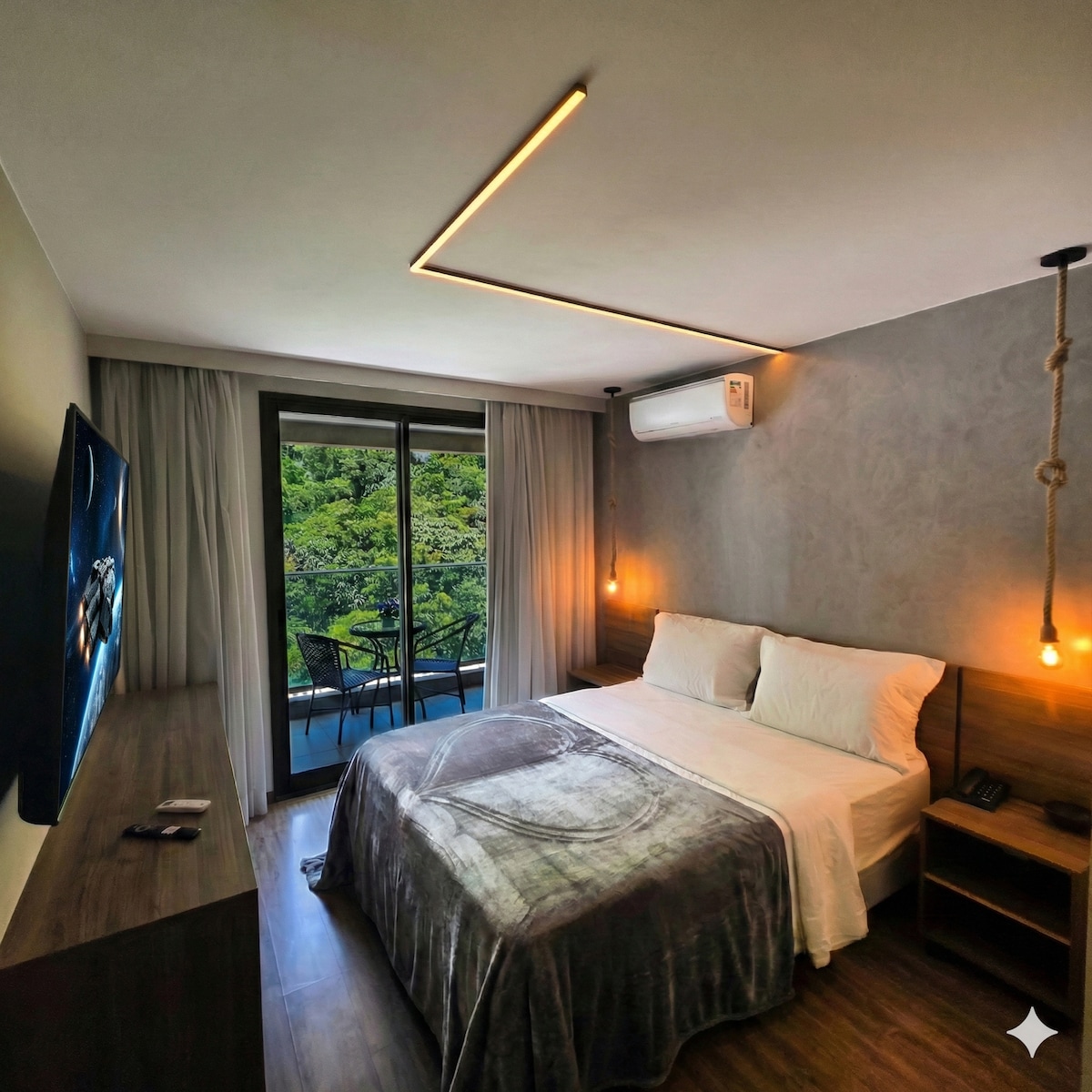 Flat moderno e aconchegante, reunindo o conforto de um hotel com a liberdade de um lar. Ideal tanto para quem viaja a lazer quanto a trabalho, o espaço conta com uma suíte com cama queen, ar-condicionado, Wi-Fi, TV e frigobar. O condomínio oferece uma excelente infraestrutura: academia, piscina, sauna, jacuzzi e restaurante com preços acessíveis. A localização é privilegiada, a apenas 100 metros do RioCentro, garantindo praticidade e fácil acesso a diversas atrações na Barra da Tijuca.