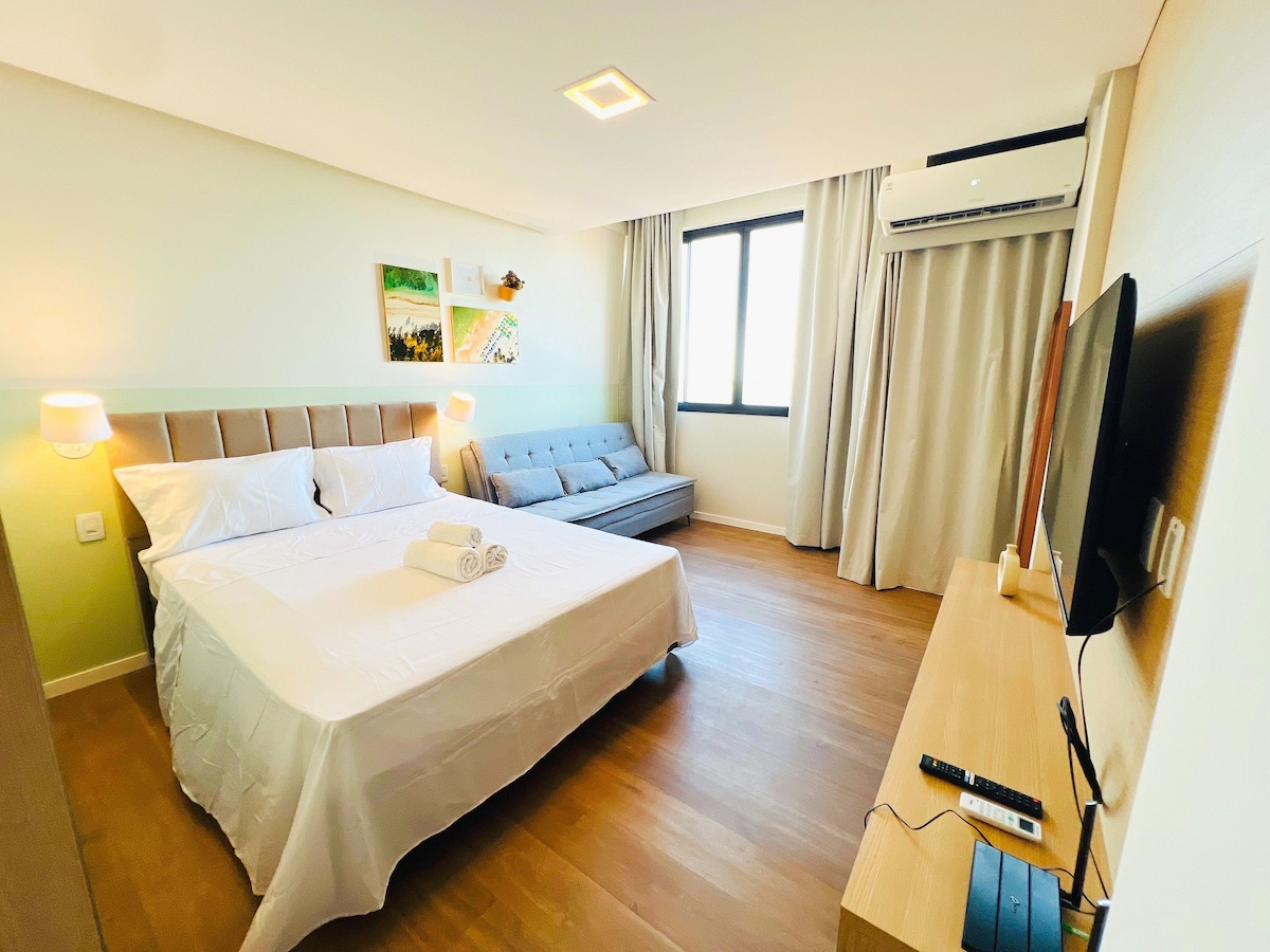 Este lugar único tiene su propio estilo. Muy bien ubicado frente a Shopping Jardins. Cuenta con: - Lugar de garaje privado y cubierto. - Piscina en la zona exterior de uso compartido. - Aire acondicionado en la habitación suite. - WC con ducha climatizada y ducha higiénica. - Cama doble y dos colchones adicionales. - Cocina completa con electrodomésticos(licuadora,sándwich , hervidor eléctrico, estufa de inducción y nevera).