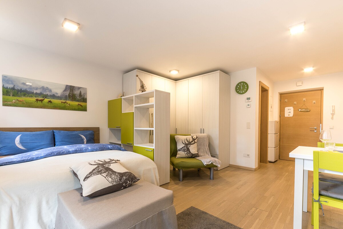 Nuestra residencia se encuentra justo a los pies de las pistas de esquí de Kronplatz para tu acceso inmediato a un día de esquí idílico. Estaciona tu auto en nuestro garaje subterráneo y luego toma el autobús de esquí gratuito al telesilla/teleférico a solo 500 m de distancia (el autobús se detiene justo en nuestra puerta). Si quieres pasar el día en Bruneck, hay un autobús cada media hora. , Nuestros estudios son ideales para 2 - 3 personas. Un sofá cama adicional también puede ofrecer espacio para otra persona. Todos los estudios incluyen un equipo completo