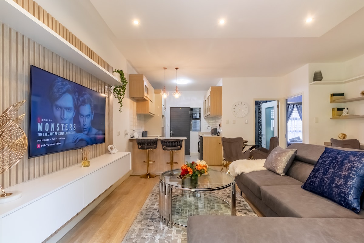 1 bedroom apartment in the heart of Sandton offers a cozy lounge with vibrant decor, a fully equipped kitchen, a modern bathroom, and a workspace. Perfect for both business and leisure travellers. Sip your morning coffee or unwind in the evening on the private balcony with stunning nighttime views. Located in the secure Cottonwoods complex, minutes from Sandton City, Fourways Mall, Mall of Africa, Montecasino, and the Sandton Gautrain. With Fast Wi-Fi.