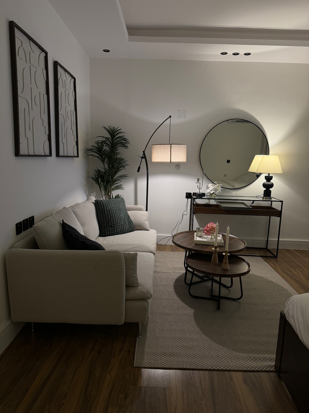 Un estudio tranquilo y elegante con check-in autónomo, que consta de una cama principal, un asiento lateral y un televisor inteligente, además de un rincón de café para hacer café y té, un hervidor de agua y un microondas, y un baño completo con herramientas de ducha. Este estudio está estratégicamente situado en el norte de Riad y está cerca de todos los servicios y eventos. No hay WiFi. Riyadh Boulevard está a 5 minutos Walnder Gunn a 8 minutos , El aeropuerto está a 18 minutos.