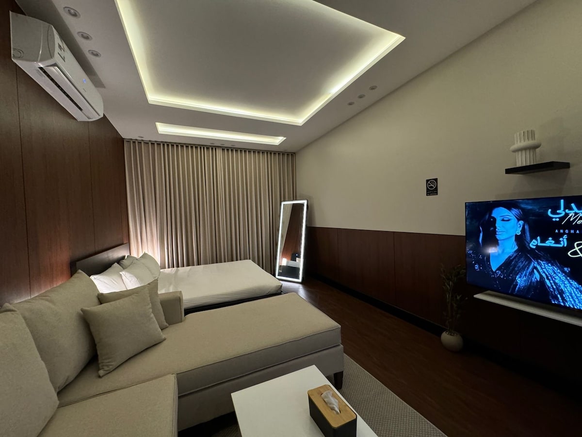 Relájate en este elegante alojamiento. Este lujoso estudio está diseñado para brindarte comodidad y total privacidad. Se caracteriza por su ubicación estratégica en los barrios más elegantes del norte de Riad, cerca de los monumentos estacionales y de ocio más famosos de Riad. También está cerca de: - Riyadh City Boulevard a 10 minutos - Aeropuerto Rey Khalid 20 minutos - Paseo Al-Ghadeer a 5 minutos - Carretera de circunvalación norte 7 minutos Otros lugares y servicios como (restaurantes - farmacia - supermercado - peluquería - lavandería) El estudio también contiene: - Pantalla de televisión de 58 pulgadas - Ambientador - Y Le deseamos una estancia feliz y siempre esperamos poder servirle