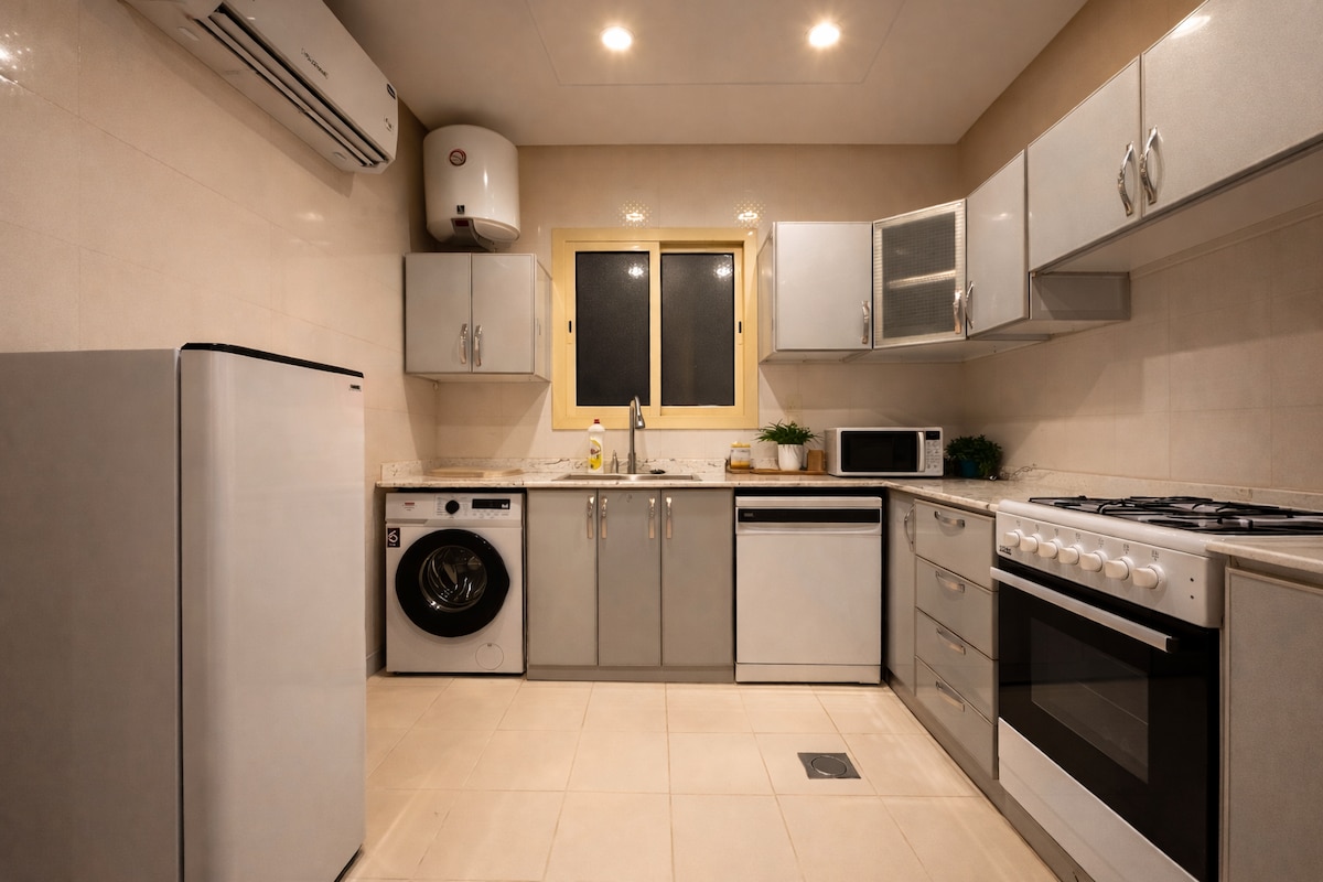 Departamento de lujo que incluye: 2 dormitorios 2 camas tamaño king 1 sala de estar. 1 comedor. 1 cocina completa 1 lavadora 1 lavavajillas. 1,5 baño. El estacionamiento es público y a veces puede llenarse. Tenga en cuenta que la hora de entrada es a partir de las 3 p. m. Tarifa por fumar: 1000SR Tarifa por salida después de la hora establecida: 300SR