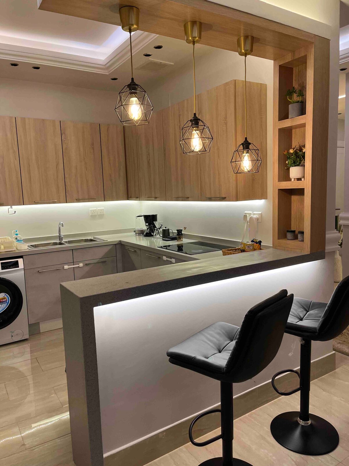 ¡Un retiro de estilo boho en Al Narjis!Acogedor apartamento de 1 dormitorio con sala de estar, cocina equipada, 2 baños y una mesa de comedor de 4 asientos. Las plantas naturales añaden frescura, iluminación suave y tonos cálidos crean un ambiente relajante. Perfecto para viajeros solitarios, parejas o estadías cortas. Wifi rápido, aire acondicionado y estacionamiento incluidos. Disfruta de comodidad, estilo y una estancia tranquila en Riad en un espacio nuevo y acogedor.