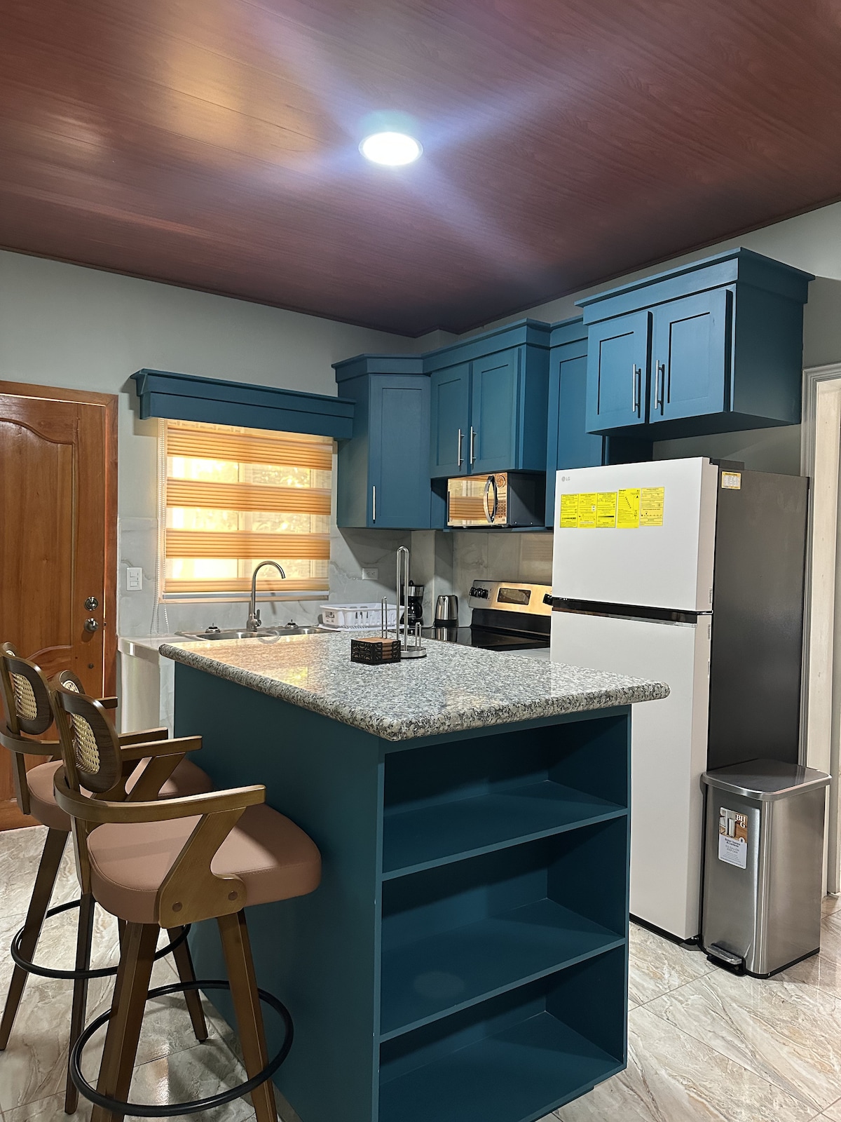 Alojamiento sencillo, tranquilo, seguro y céntrico estilo isla. Ven a sentarte y termina el día con una bebida relajante en tu terraza, en medio de un exuberante jardín. Tu dormitorio en la planta baja, una suite, cuenta con una cama tamaño queen, una cocina completa y un baño de 3 piezas.
