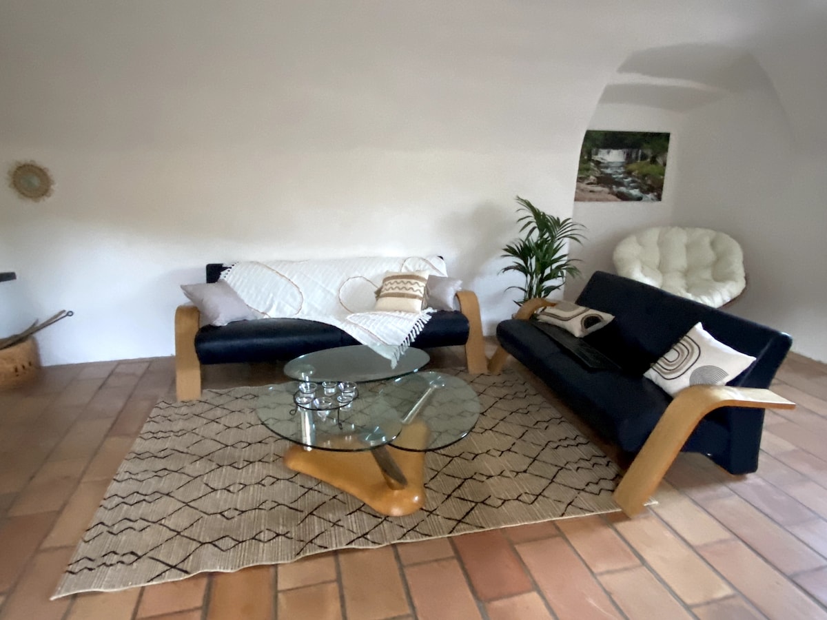Bienvenido a nuestro apartamento de 35 m² situado en una antigua masía típica de las Cevenas. Disfrute de un patio interior privado, una terraza y una terraza común con vistas al pueblo, además del apartamento. Muchas rutas de senderismo salen de casa. Con mi cónyuge Mathieu, ambos guías, estaremos encantados de asesorarle o proponerle paseos. En el lugar, un estudio de artes aéreas (tela, aro, hamaca) permite organizar clases particulares.