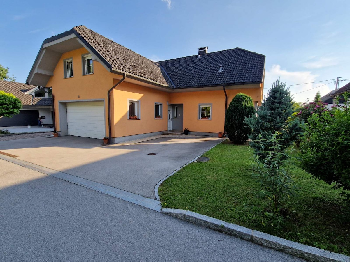 Our 2 bedroom apartment with 1 bathroom, kitchen, spacius living room with couch and dining table, A/C, and spacius patio is located just around 100 meters from Lake Bled (swimming area). It's located in very peaceful area. It has it's own entrance and is located in our house (so we're always nearby to help). We're a family of 5 and will be happy to host you. Sustainability: We produce more energy than we use. Tourism tax (3,13 for adults per day, 1,56 for children above 7) is not included.