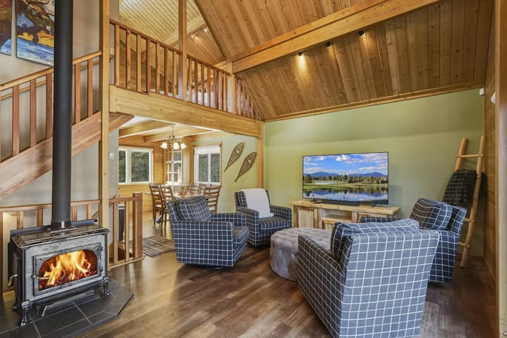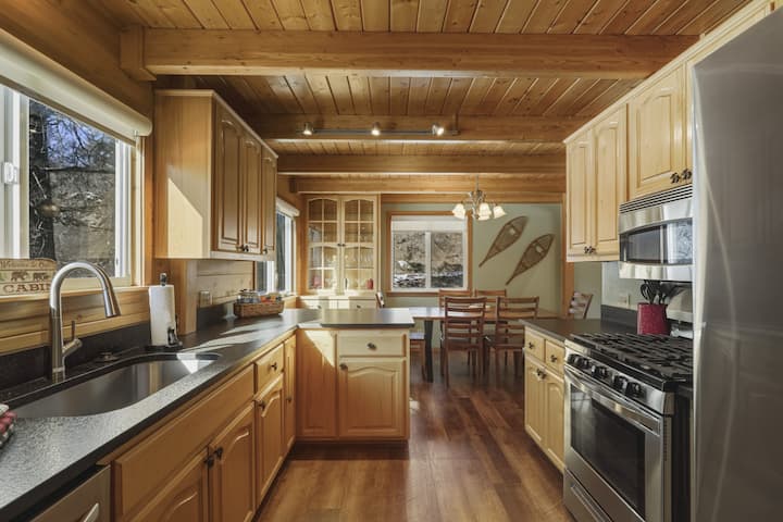 En el interior, la cabaña se siente cálida y acogedora. La cocina bien surtida hace que cocinar comidas sea fácil, ya sea que estés preparando un abundante desayuno antes de un día de exploración o cenando afuera en la parrilla de gas mientras se pone el sol.