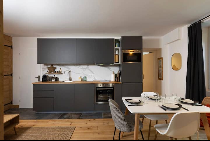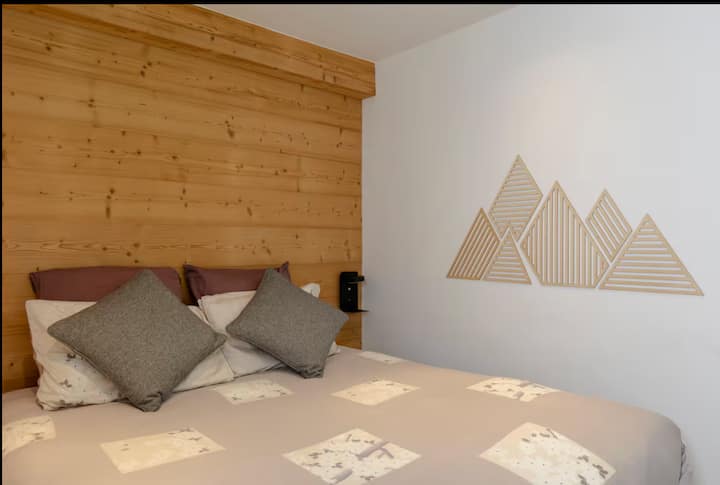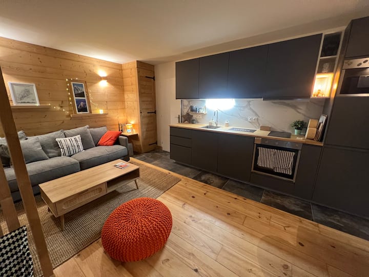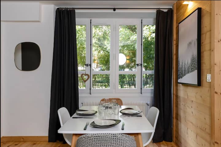 En el centro de Chamonix, a 2 minutos a pie de la Aiguille du Midi y de la estación de autobuses (conexión con el aeropuerto de Ginebra), descubra un apartamento totalmente renovado en la planta baja. Ideal para una pareja, o deportista en busca de descanso, ofrece una habitación modular, una luminosa sala de estar con cocina muy bien equipada y un jardín privado de 70 m², raro en el centro de la ciudad. Tranquilo, cómodo y a pie de todo: esquí, senderismo, comercios y restaurantes. ¡Este apartamento ha sido diseñado por amantes de Cham!