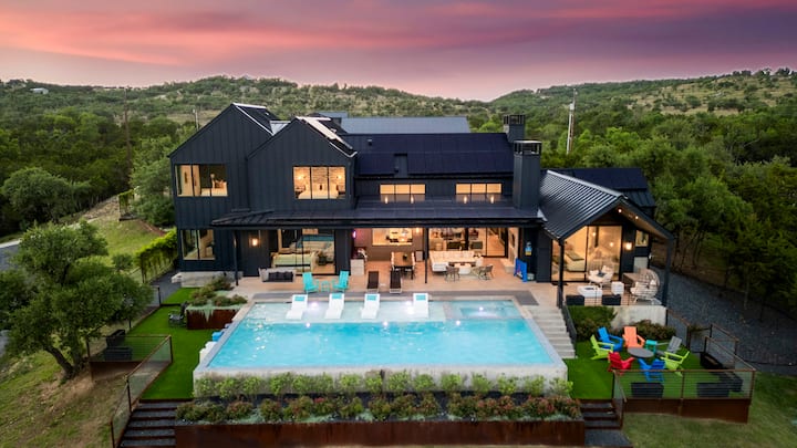 ✨ Permite 20 para reuniones corporativas fuera del sitio. Una finca de lujo única en Dripping Springs, construida en el 22, con una casa de lujo personalizada y un granero de fiestas separado. Con 7300 pies cuadrados de espacio habitable en 9 acres de jardines ajardinados, es ideal para escapadas y retiros corporativos productivos. Disfruta de un estanque de ½ acre con cascada, animales amistosos (mini burro, mula, pollos), pickleball, piscina del resort con voleibol, spa, baloncesto, sala de juegos, dos cocinas completas, dos bares y más.