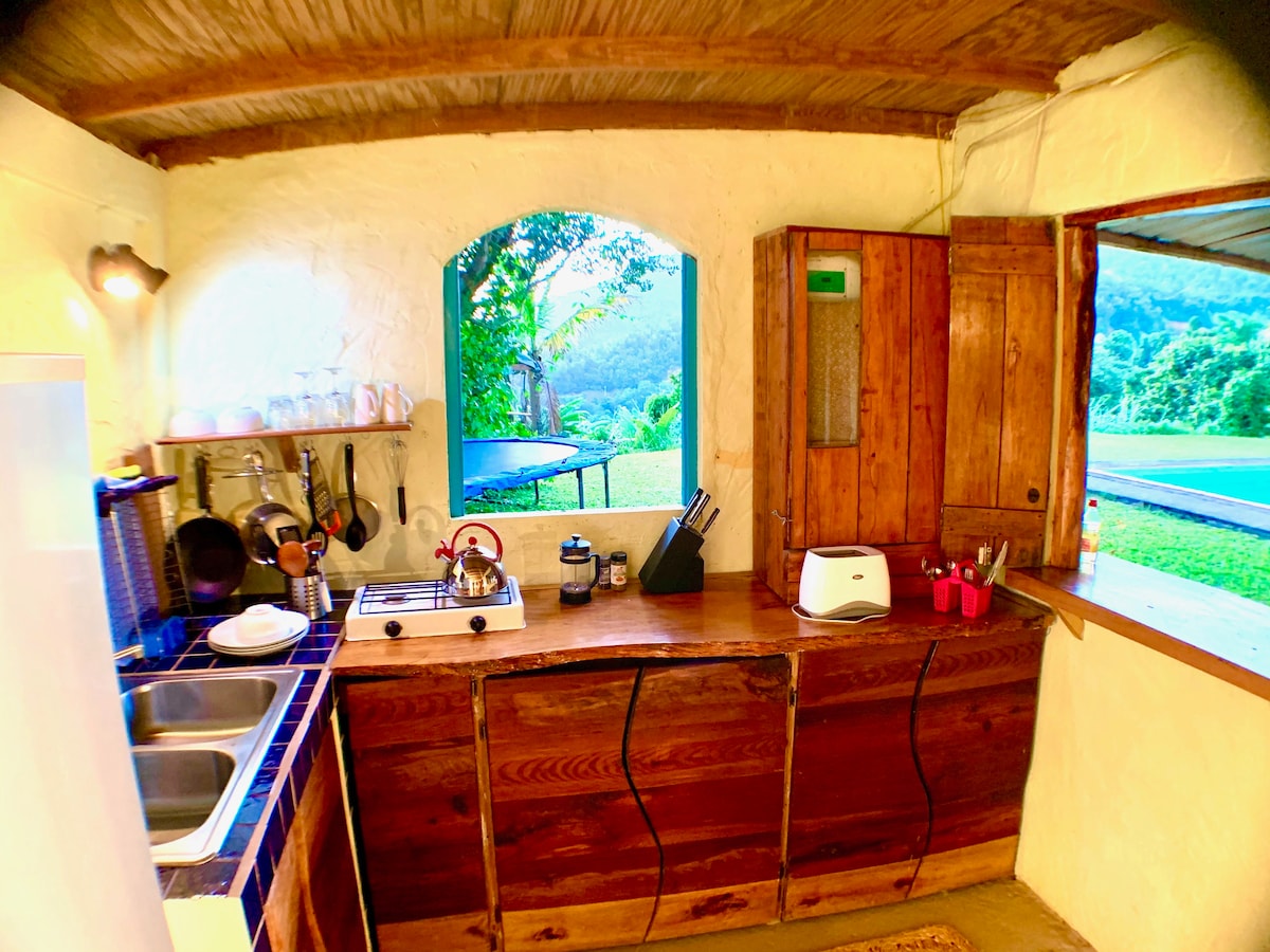Visto en «10 destinos caribeños más asequibles» Casa de campo artesanal de estilo casa del árbol en la ladera de una colina con capacidad para 6 personas Convenientemente ubicada Vistas panorámicas al mar. Rodeado de naturaleza. Estudio de nivel superior: el espacio habitable principal con cama tamaño queen y cama individual, baño privado, cocina pequeña y salón al aire libre. Nivel inferior: segundo dormitorio con cama tamaño queen y cuna opcional de IKEA, baño privado y gran terraza. Ideal para parejas, amigos y familiares.