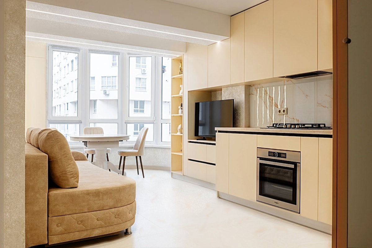 Relájate en un elegante apartamento en el corazón de Chisinau, con acabados de mármol y madera natural. Disfrutarás de un colchón Vi-Spring Bedstead de primera calidad, una bañera espaciosa y un balcón con chimenea decorativa. El departamento cuenta con cortinas de control remoto y una máquina de café espresso. El bloque se beneficia de recepción y seguridad 24/24, lo que le brinda seguridad, comodidad y tranquilidad adicionales durante su estancia.