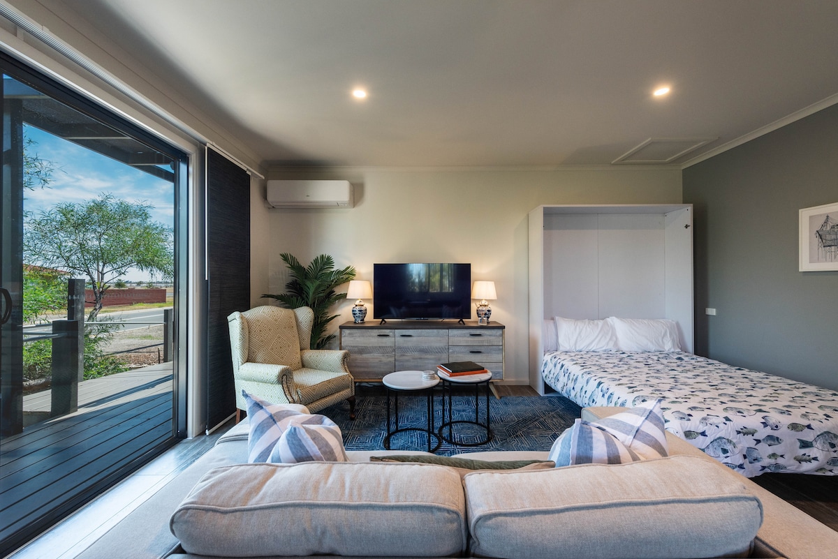 Perfecto para una o dos personas, The Writer's Studio es totalmente independiente. Tiene una cama tamaño queen hinchable muy cómoda y firme. Lejos de la casa principal, se abre a un pequeño huerto. Este es un oasis tranquilo que puedes disfrutar mientras exploras todo lo que Barossa tiene para ofrecer. Cuenta con comedor y sala de estar, así como un rincón de lectura en el loft. Tiene un sofá que se puede abrir para un niño si es necesario. O podemos instalar otra cama inflable en el loft, al que se accede por una escalera de loft.