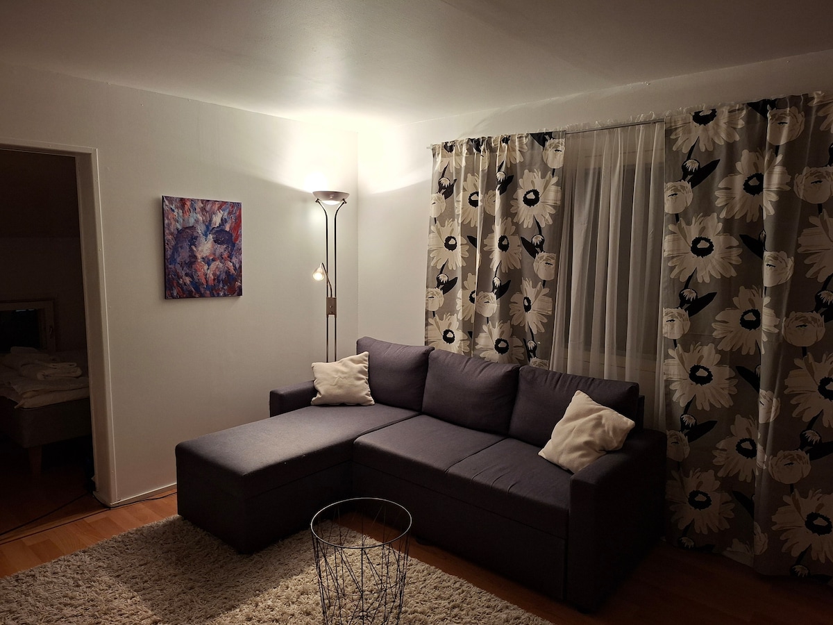 Cómodo departamento de una habitación cerca del centro. A 1,2 km del centro. El pueblo de Santa Claus está a 9 km. El aeropuerto está a 9 km. Parada de autobús junto a la casa. Compra a 200 metros de distancia. El equipo es ideal para estancias más largas. La cama es para dos y el sofá se puede hacer una cama supletoria para dos personas. El ancho del sofá cama es de 140 cm. El sofá cama tiene su propio colchón, así que también es cómodo para dormir. Indica si quieres que la cama se convierta en el sofá. Espacio para autos disponible. Cuesta € 5 por estancia.