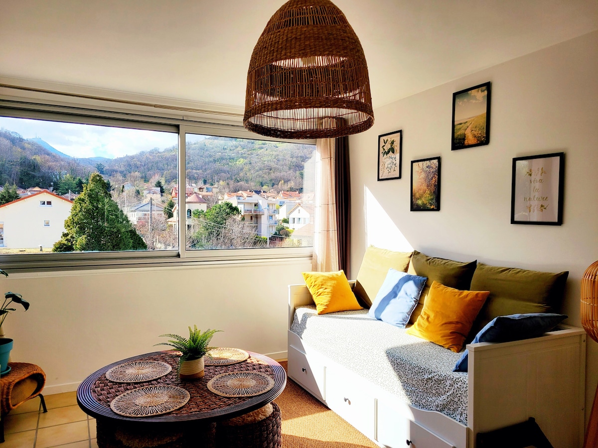 Situado en Royat, disfrute de un alojamiento elegante y céntrico totalmente equipado( microondas grill, vitrocerámica, lavadora,wifi box fibra, Senseo...) Situado a 8 minutos de la plaza de Jaude en autobús , a 50 metros de las Termas, de Royatonic (zona de baño para relajarse) y del Casino de Royat Ideal para estancias de curación. El transporte está disponible a 50 metros (línea B directa a la estación de tren SNCF) El aparcamiento del Panoramique des Dômes se encuentra a 7,5 km y a 14 km de Vulcania.