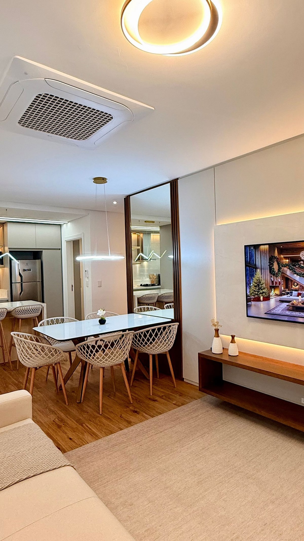 O flat é completo com a estrutura de um hotel e o conforto de casa. Lareira na sala, piscina aquecida, sauna, brinquedoteca, academia. Cozinha gourmet integrada, ar condicionado quente e frio, cama queen. Região tranquila, apenas 700 metros da Catedral de Pedra (cartão postal/centro de Canela). Fica em uma rua residencial arborizada, com fácil acesso a cafés, restaurantes e lojas. Serviço de café da manhã (custo à parte) entregue no apto. Garagem rotativa no subsolo, inclusa na diária.