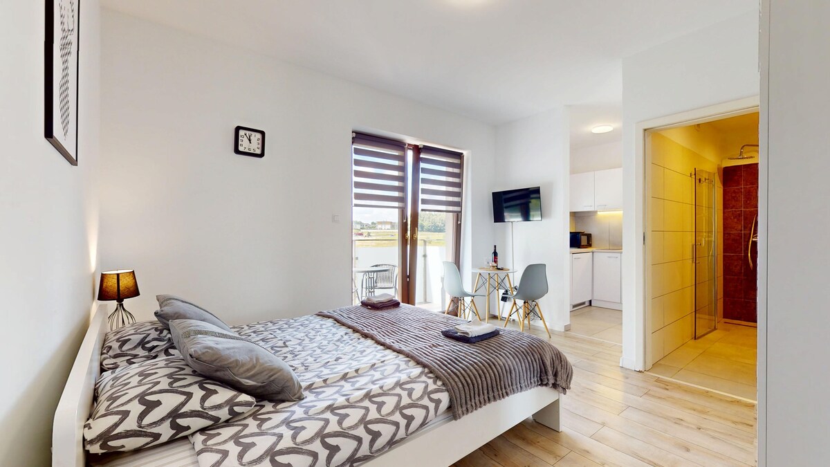 Moderno apartamento en una zona tranquila y verde, a pocos minutos de la autopista. Perfecto para viajeros de negocios y turistas. Los huéspedes tienen acceso a: una amplia sala de estar con cocina y comedor (también como lugar para dormir), un dormitorio con una cama doble, una habitación individual, un baño con bañera y ducha, un gran balcón. Apartamento en el primer piso, con una entrada independiente y un espacio de estacionamiento para 2 autos.