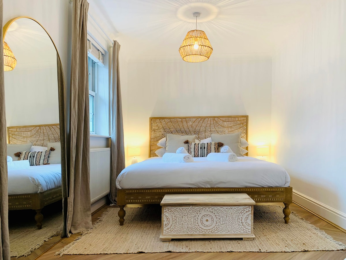 Hermoso, espacioso apartamento orientado al sur con impresionantes vistas al mar, características originales y techos altos. ¡Los amaneceres/puestas y los reflejos de la luna son impresionantes! Entre St Leonards on Sea y Hastings, ¡y a 30 segundos de la playa! El dormitorio tiene una cama tamaño king y la sala de estar un sofá cama doble. La ropa de cama es de algodón/ropa de cama lavada con productos no tóxicos. ¡El apartamento está en el tercer piso, pero no hay tantas escaleras y, como tal, con vistas al mar lejos de la multitud enloquecida! Hay estacionamiento gratuito cerca