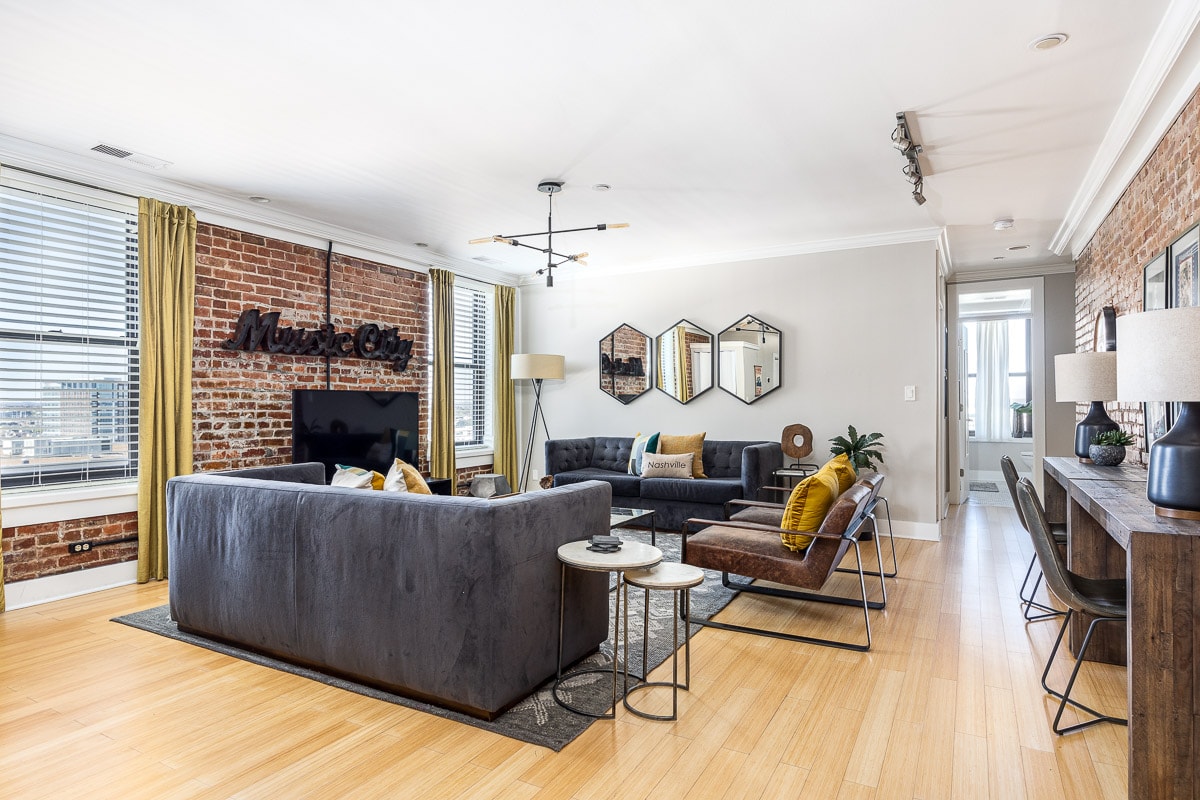 Este espacioso apartamento de 1.134 pies cuadrados, 2 dormitorios y 2 baños se encuentra justo en el centro de la ciudad y se puede ir andando a todas partes. Este alojamiento es ideal para 2 parejas, un grupo de amigos o una familia que quiera disfrutar de Nashville con estilo. La unidad está actualizada con encimeras de granito, cocina moderna completa, suelos de madera, paredes de ladrillo a la vista y persianas eléctricas con control remoto. ¡No necesitas alquilar un coche ni llamar a un Uber aquí!